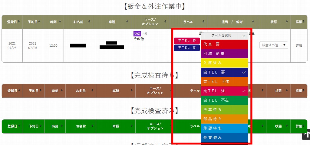 車の細やかな状態・状況管理はラベルを活用しているため、今となってはもう無いとお店が回らないと思います。自社ではラベル機能を使って入庫済みや作業完了+電話済み等を簡単に管理したことで、お客様から預かっているお車の進捗状況を整備士とその都度やり取りが要らなくなりました。
