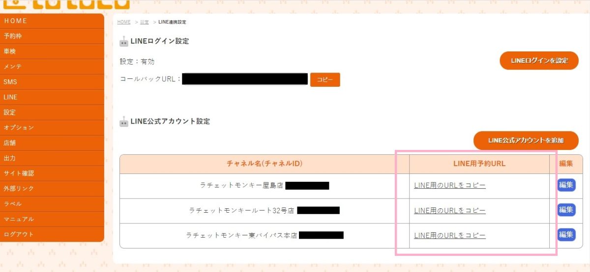 設定後にはHOME>設定>初期設定>LINE連携設定と進み、LINE用予約URLで発行できるURLをリッチメニューなどに設定いただくとLINE連携が完了です。