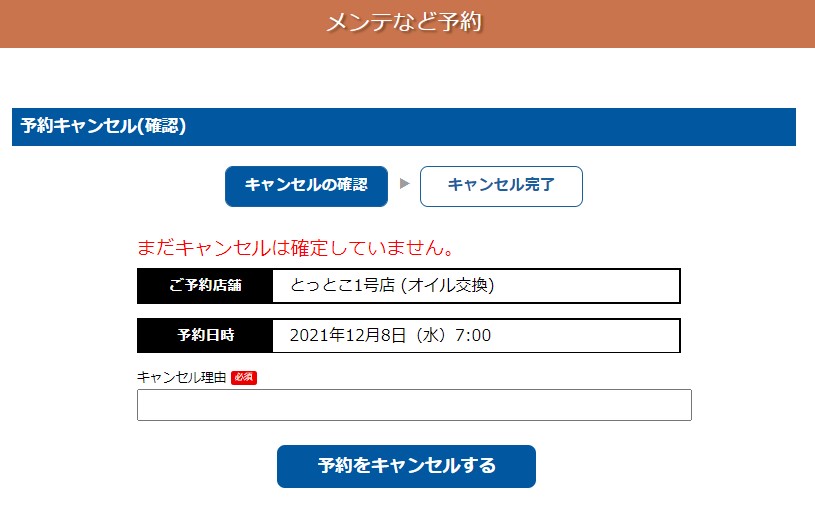 『予約のキャンセル』に進むと、キャンセル理由をご記入いただき、予約をキャンセルボタンから予約のキャンセルが可能です。